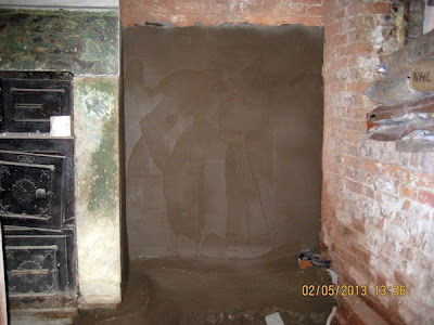 The internal plasterwork begins to cover over the evidence of earlier fireplaces and alterations to the rear wall facing Jackson Pit.
